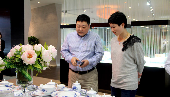 公司董事長王耀在給吳靜鈺介紹中南海二代瓷