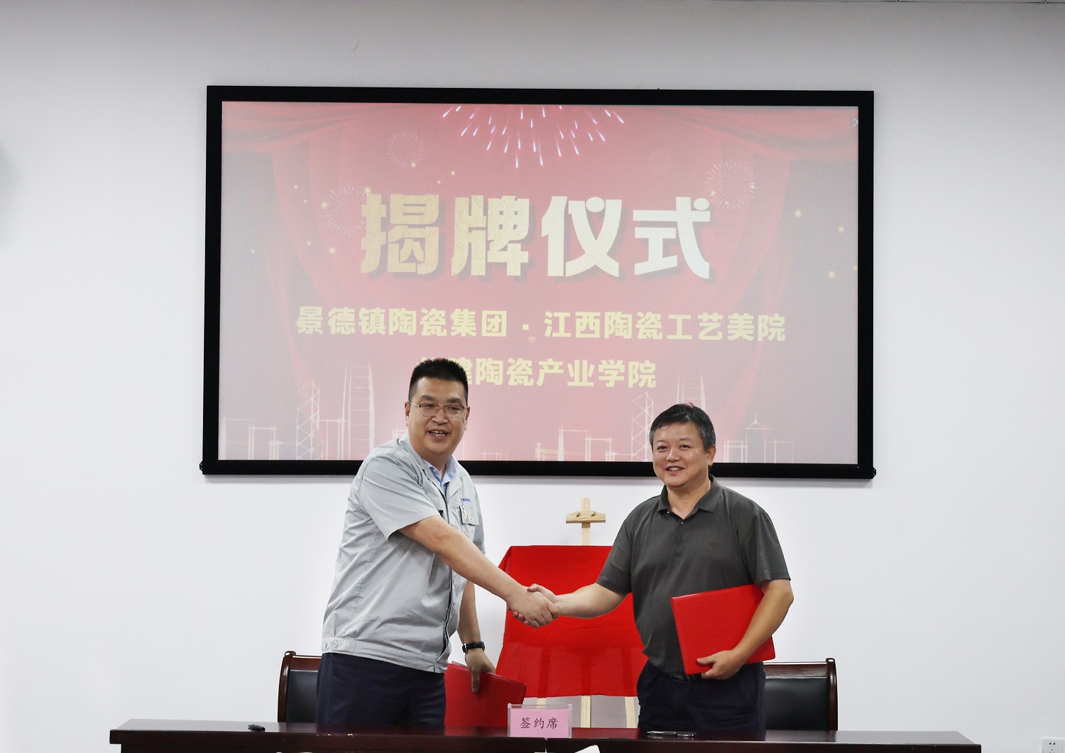 為深入貫徹落實國家推進“一體兩翼”重大戰(zhàn)略部署,更好地服務地方陶瓷產(chǎn)業(yè)發(fā)展,助推陶瓷職業(yè)教育發(fā)展。8月16日下午,在景德鎮(zhèn)陶瓷集團行政樓一樓會議室隆重舉行江西陶瓷工藝美術職業(yè)技術學院與景德鎮(zhèn)陶瓷集團共建陶瓷產(chǎn)業(yè)學院揭牌儀式。江西陶瓷工藝美術職業(yè)技術學院黨委書記方文龍,黨委委員、副院長朱輝球,景德鎮(zhèn)陶瓷集團黨委書記、董事長鄧景揚,黨委副書記、總經(jīng)理邢浩,黨委委員、工會主席鄧必春,黨委委員胡軼,黨委委員、副總經(jīng)理王小勤出席揭牌儀式。學院及企業(yè)相關部門負責人參加。