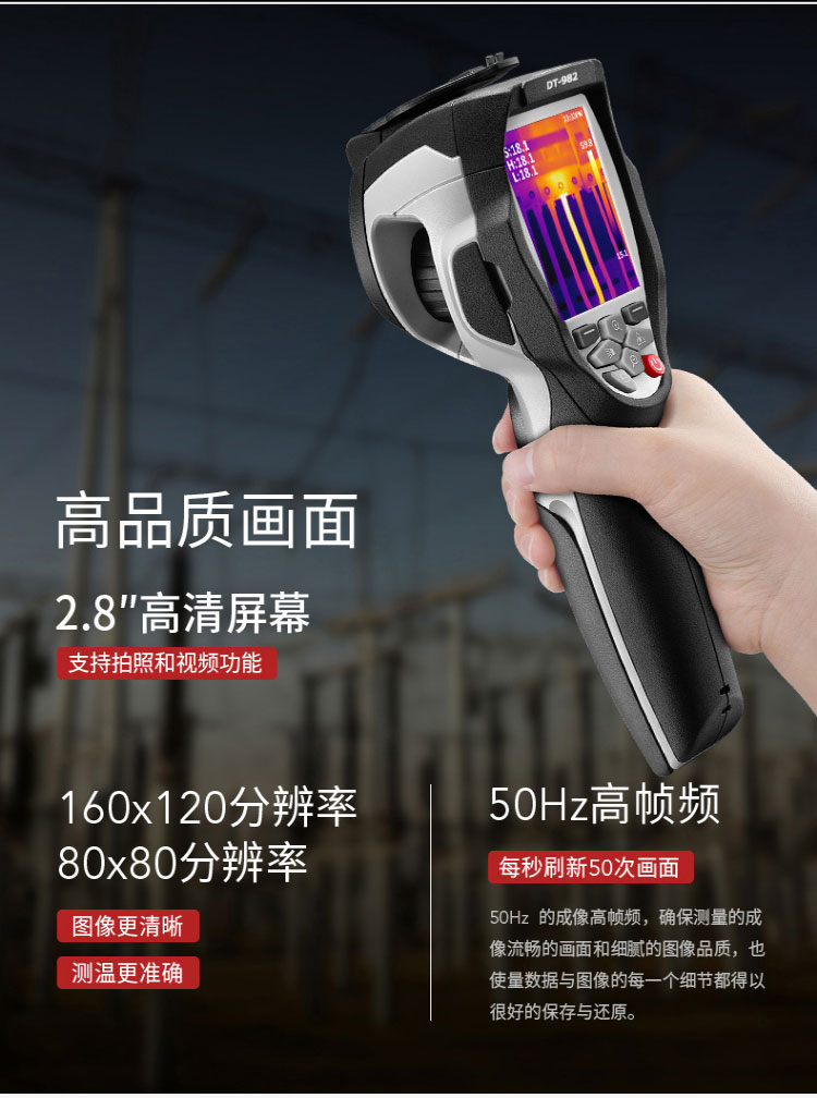 DT-980H、DT-982H紅外熱像儀可以對(duì)高溫物體(可達(dá)650℃)提供非接觸式溫度分布測(cè)量,具有高動(dòng)態(tài)分辨率和高空間分辨率,特別為高溫測(cè)量、惡劣的工業(yè)環(huán)境下長(zhǎng)期使用而設(shè)計(jì),有助于快速診斷和報(bào)告設(shè)備問(wèn)題。