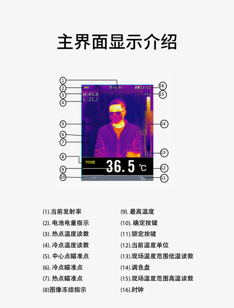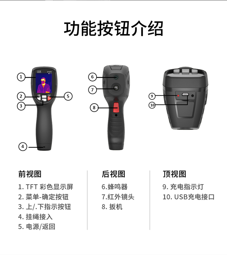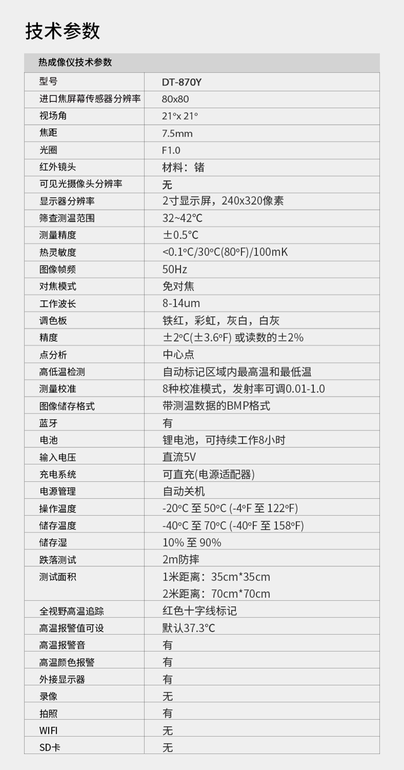 分辨率:80*80、圖像幀頻:50HZ、篩查測(cè)溫范圍:32-42℃、藍(lán)牙連接手機(jī)軟件