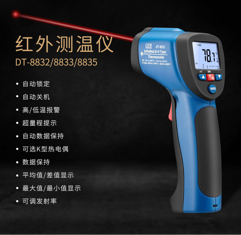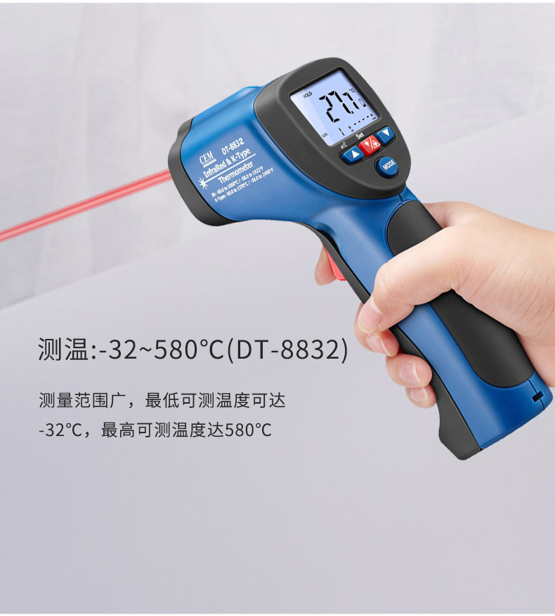 華盛昌DT-8832二合一紅外線測(cè)溫儀屬于紅外測(cè)溫儀,鋌和華盛昌CEM品牌專區(qū)提供詳細(xì)的華盛昌DT-8832二合一紅外線測(cè)溫儀介紹,包括華盛昌DT-8832二合一紅外線測(cè)溫儀價(jià)格、基本參數(shù)、產(chǎn)品特點(diǎn)、華盛昌DT-8832二合一紅外線測(cè)溫儀圖片、功能及適用范圍等信息,還有華盛昌DT-8832二合一紅外線測(cè)溫儀問(wèn)答及用戶評(píng)價(jià)為您選購(gòu)提供全方位的參考。想了解更多更全的華盛昌CEM紅外測(cè)溫儀報(bào)價(jià)、型號(hào)、種類以及使用方法相關(guān)內(nèi)容,可以到華盛昌CEM品牌專區(qū)。 華盛昌DT-8832二合一紅外線測(cè)溫儀是紅外測(cè)溫和K型溫度測(cè)溫結(jié)合的二合一紅外線測(cè)溫儀 雙注塑機(jī)殼、1米防摔,高達(dá)30:1的距離比 帶K型熱點(diǎn)偶測(cè)溫,可以根據(jù)您的需要適應(yīng)不同場(chǎng)合的測(cè)溫要求。 溫度段從380℃至1050℃滿足測(cè)溫場(chǎng)景 ℃/℉溫度單位轉(zhuǎn)換 可達(dá)±1.5%測(cè)量精度 自動(dòng)數(shù)據(jù)保持 20個(gè)數(shù)據(jù)儲(chǔ)存 最大值/最小值顯示 K型熱電偶測(cè)溫(量程設(shè)計(jì)-50℃至1370℃) 超亮背光LCD顯示,在暗處也可以輕易測(cè)量和讀數(shù) 自動(dòng)獲取目標(biāo)的可調(diào)發(fā)射率,可測(cè)量不同材質(zhì)的物體表面溫度 距離比D:S=16:1,30:1供選擇,高距離比可遠(yuǎn)距離測(cè)量更小尺寸目標(biāo)
