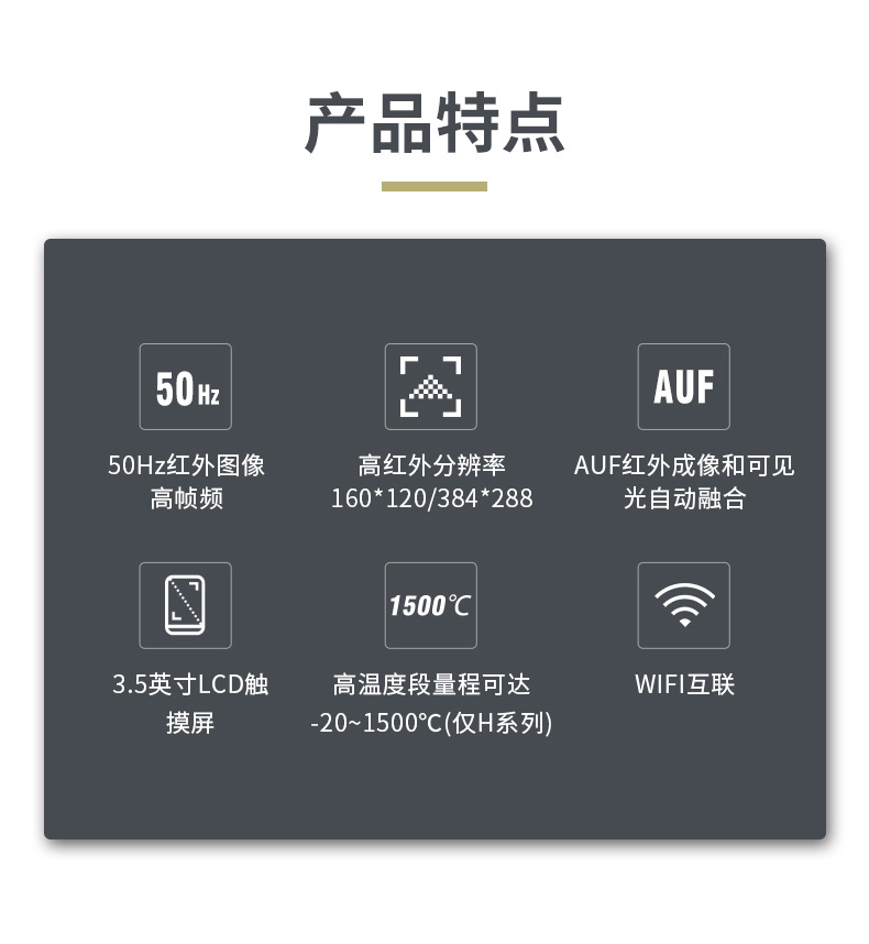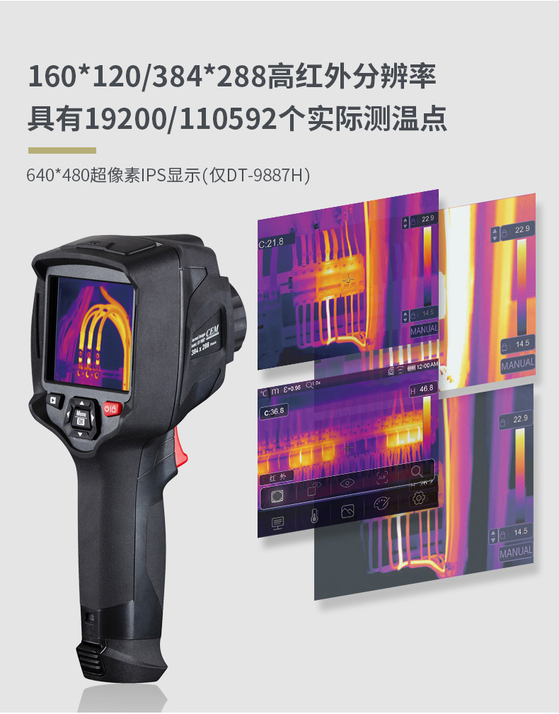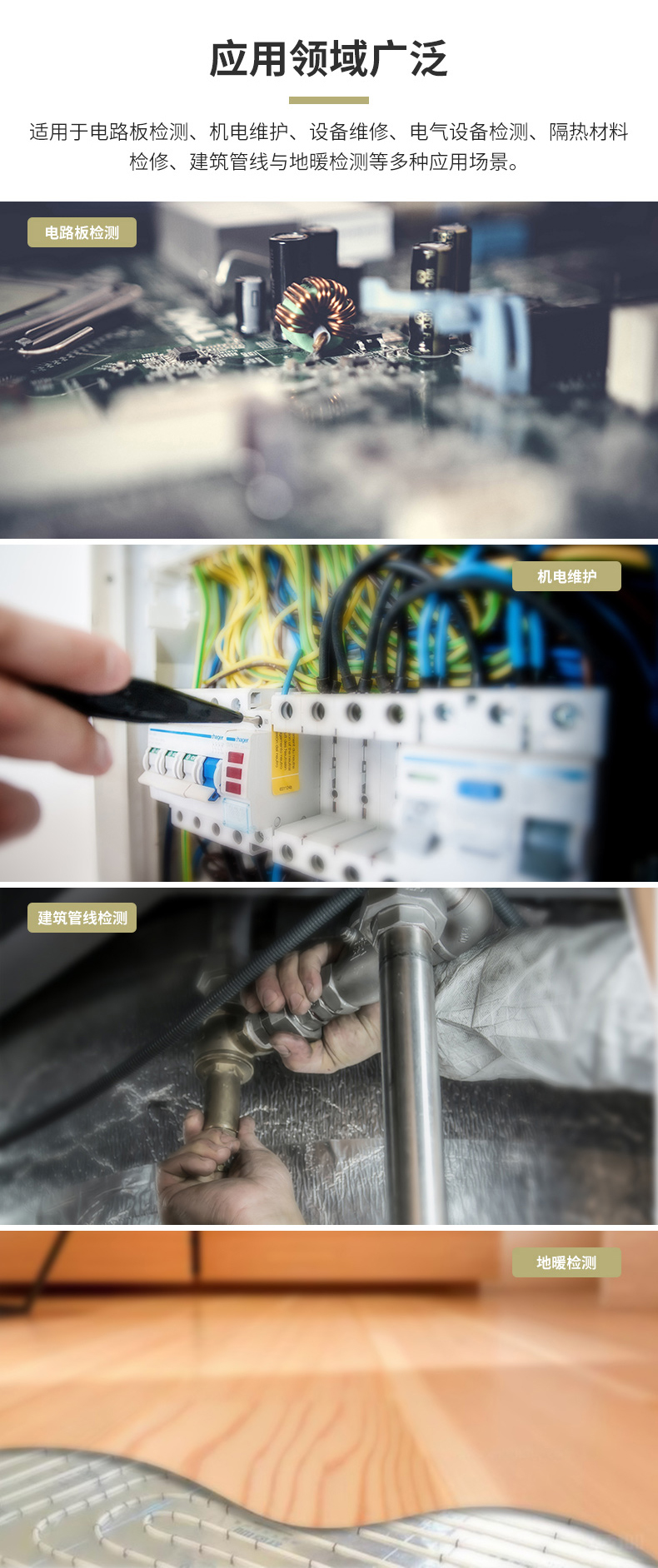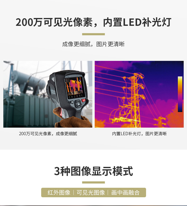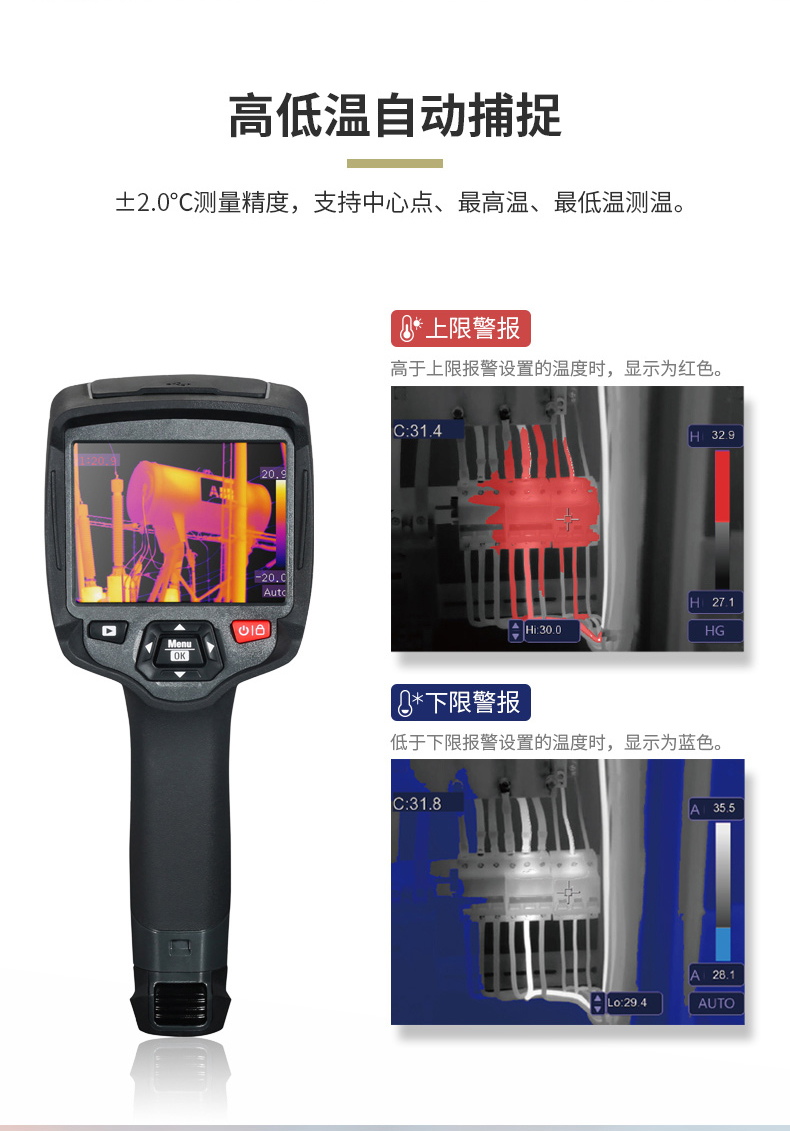 標配鏡頭22mm,分辨率324×288,IFOV:1.14mard,視場角24.5×18.6°,熱靈敏度NETD<0.06℃,圖像幀頻50Hz,溫度范圍(-20-150、0-400),可見光分辨率640×480像素