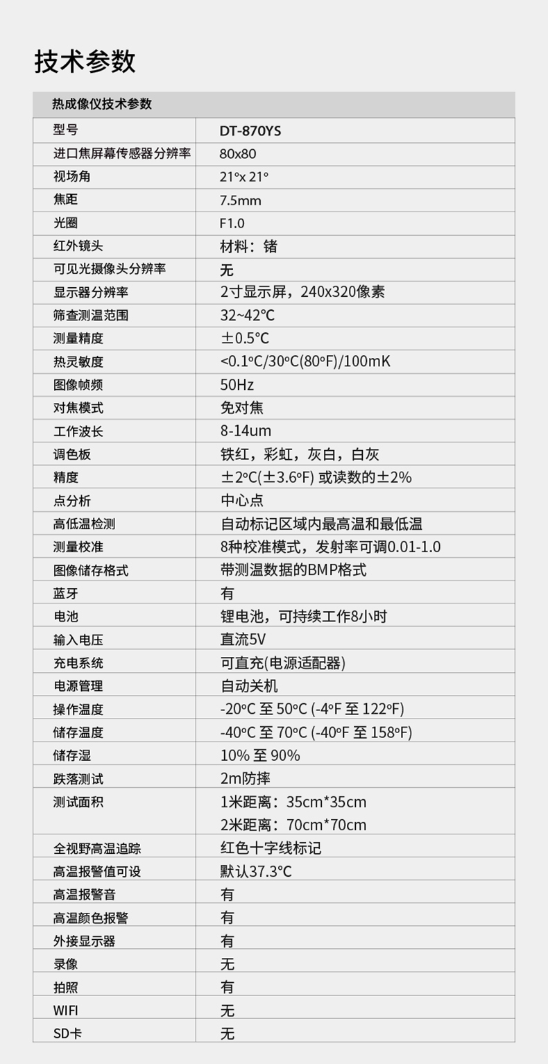 分辨率:80*80、圖像幀頻:50HZ、篩查測溫范圍:32-42℃、DT-8780YS外接10.1英寸PAD大屏,可實(shí)現(xiàn)多人同時(shí)測溫,AI人臉識(shí)別