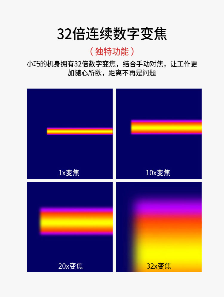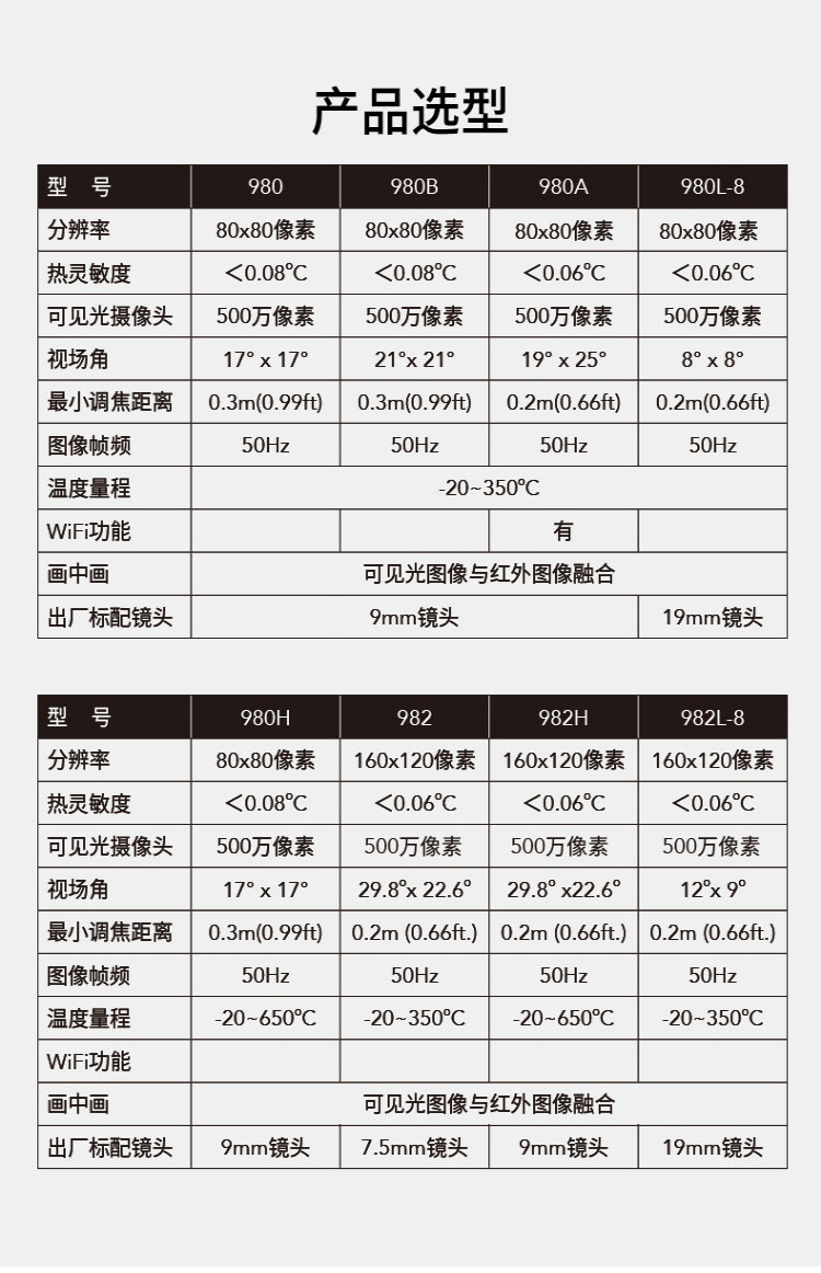 標配鏡頭9mm,分辨率80×80,IFOV:3.77mard,視場角17×17°,熱靈敏度NETD<0.06℃,圖像幀頻50Hz,溫度范圍(-20-150、0-350),可見光分辨率500萬像素