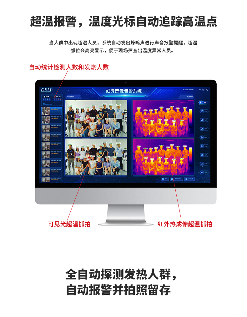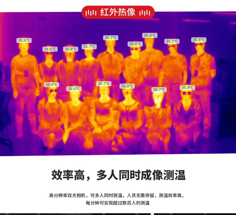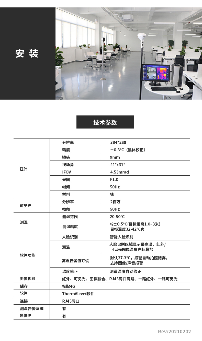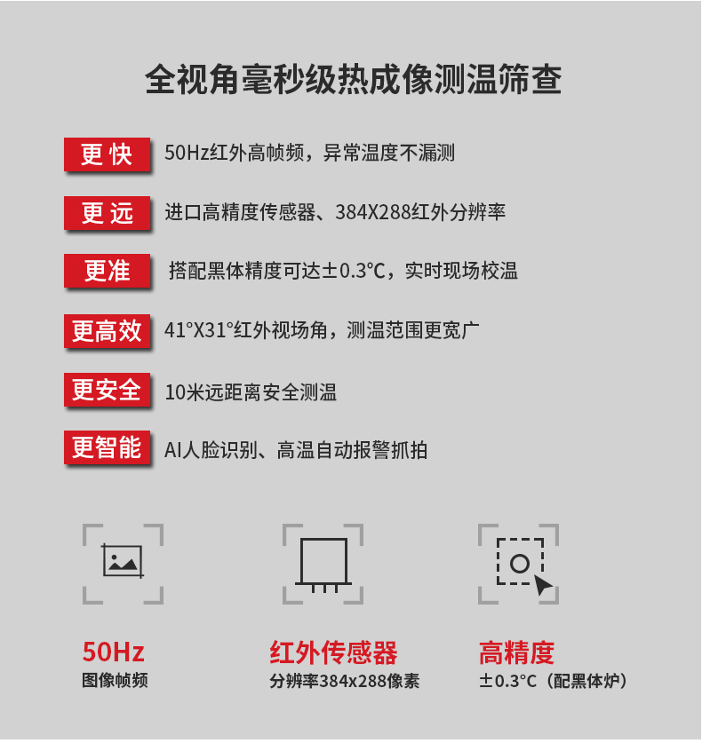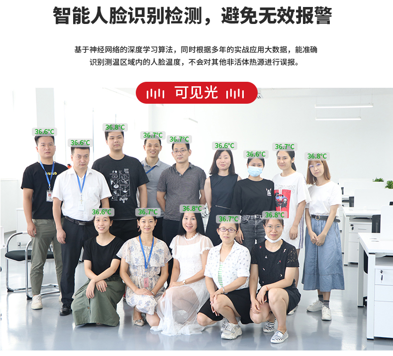 ·標(biāo)配黑體,實時溫度校正,測溫精度士0.3°℃·智能快速識別測溫,效率可達900人/分鐘·AI人臉識別,排除異常熱源干擾,誤報率更低20年非接觸紅外測溫研發(fā)經(jīng)驗,測溫更優(yōu)更準(zhǔn)確
