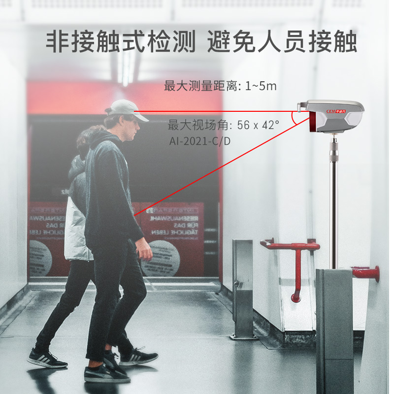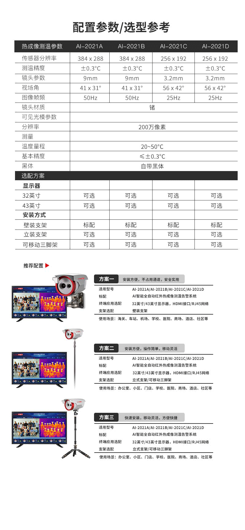 2安裝與維護(hù) 2-1,紅外熱像告警系統(tǒng)部署原則 Al-2021紅外熱像告警系統(tǒng)屬于精密測溫和成像設(shè)備,對部署應(yīng)用有一定要求,注意事項如下: ·安裝環(huán)境:設(shè)備機頭所處位置需光線良好(照明度≥10OLux),應(yīng)避免處于逆光的位置;設(shè)備機頭布置位置附近3米范圍內(nèi)不應(yīng)有空調(diào)出風(fēng)口;設(shè)備機頭所監(jiān)控的視場內(nèi),不能受到光照、西曬等外界強熱源的干擾; ·機頭布置:合理布置A-2021機頭的位置,向下俯視角度為13°~15°;合理布局人員檢測位置和范圍,AI-2021機頭的攝像頭距離被測人員的額頭的位置為1.0~5.0米,最佳測試位置為2.0米;