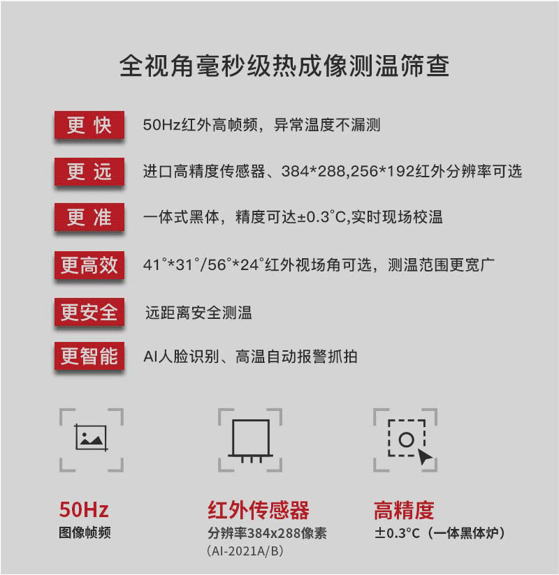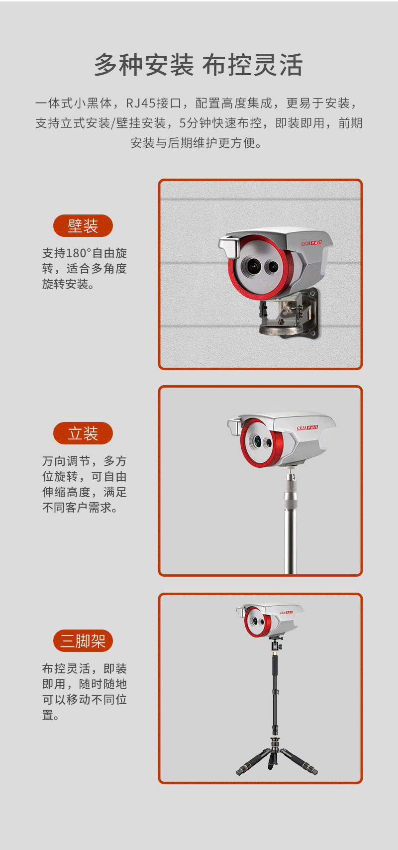 注意事項 紅外熱像告警系統(tǒng)應(yīng)正確安裝,可自動跟蹤人體額頭區(qū)域并顯示體溫,操作人員應(yīng)經(jīng)生產(chǎn)廠家專業(yè)培訓(xùn),并嚴(yán)格按說明書使用。 ·應(yīng)嚴(yán)格按照中國國標(biāo)(GB_T19146-2010)和各地市場監(jiān)管局的要求創(chuàng)造使用條件;﹒嚴(yán)格按照規(guī)范要求,安裝在室內(nèi)無風(fēng)或者微風(fēng)的固定位置使用,室溫環(huán)境在16°℃~32℃,避免陽光、風(fēng)和其他熱源干擾(環(huán)境溫度超出16°℃~32°℃,需要安裝空調(diào),并在產(chǎn)品3m內(nèi)無風(fēng)或者微風(fēng)); ·若安裝在室外,必須搭建棚子或者板房來保證環(huán)境穩(wěn)定; ·戶外陽光照射后、劇烈運動后或從溫差較大的戶外場景進(jìn)入室內(nèi),需在室內(nèi)環(huán)境平靜靜置5分鐘后進(jìn)行測試。