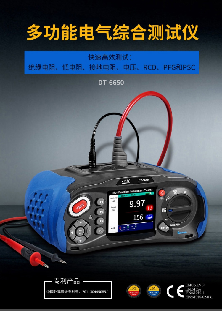 CEM DT-6650專業(yè)的多功能電氣綜合測(cè)試儀, 3.5"高清彩色TFT液晶顯示屏,雙注塑機(jī)殼,可測(cè)絕緣電阻、接地電阻、低電阻、回路電阻、電壓、RCD、PFG和PSC,并有配套軟件系統(tǒng),同時(shí)具有快速取樣、雙顯示、清晰的按鍵和大屏等優(yōu)點(diǎn),方便用戶簡(jiǎn)單清晰地操作,可以確保電氣裝置在家庭、商業(yè)、工業(yè)等領(lǐng)域應(yīng)用的安全性,以及固定接線安裝的安全性和準(zhǔn)確性,是電力電氣領(lǐng)域的專業(yè)電力檢驗(yàn)工具。
