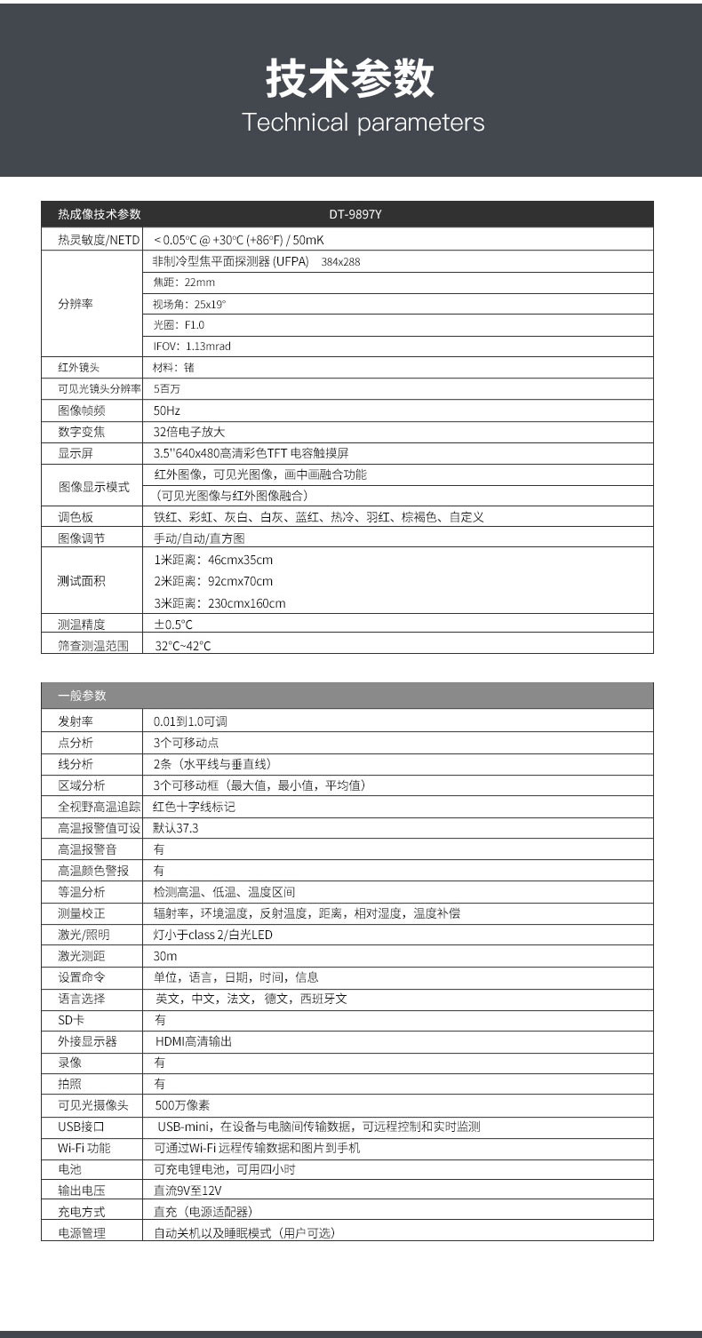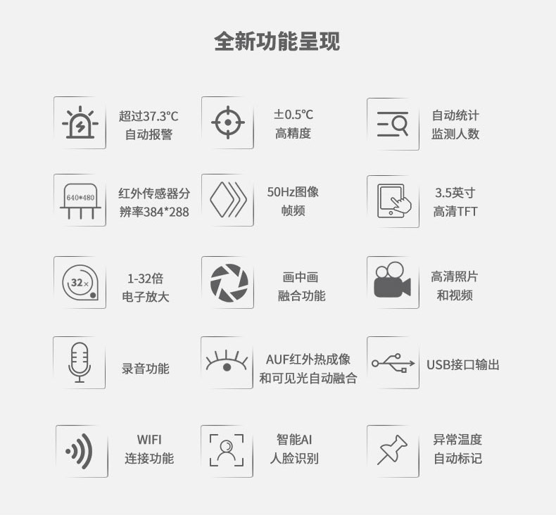 分辨率:384*288、圖像幀頻:50HZ、篩查測溫范圍:32-42℃、HDMI輸出大屏全屏顯示、AI人臉識別、自動統(tǒng)計(jì)監(jiān)測人數(shù)、可同時(shí)完成多人測溫。