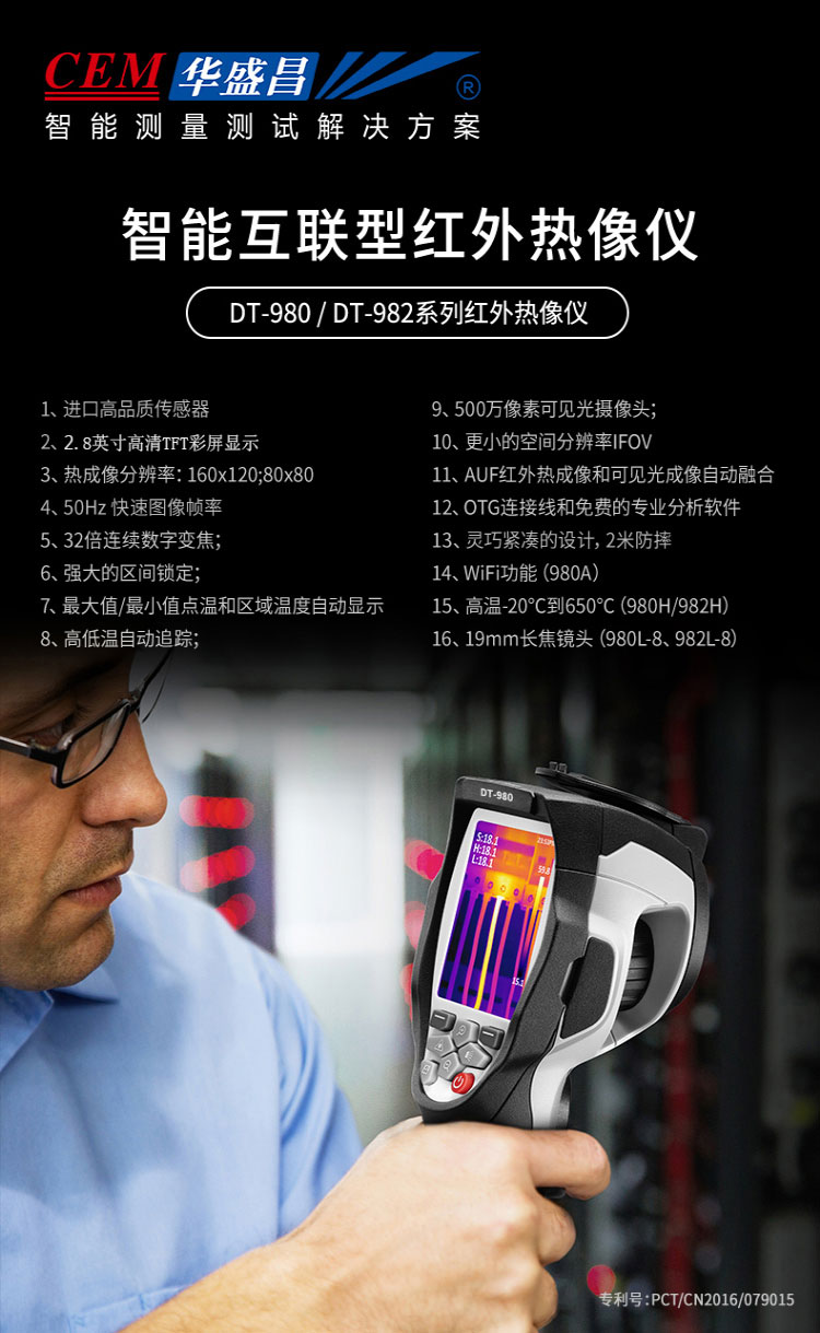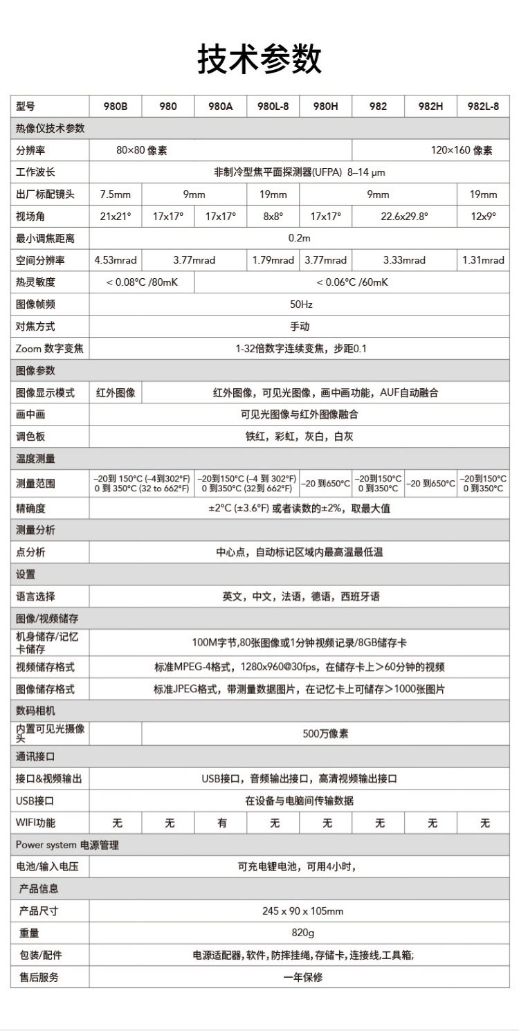 標(biāo)配鏡頭7.5mm,分辨率80×80,IFOV:3.77mard,視場角17×17°,熱靈敏度NETD<0.06℃,圖像幀頻50Hz,溫度范圍(-20-150、0-650),可見光分辨率500萬像素