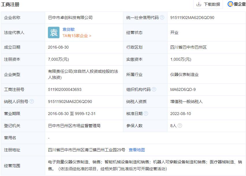 現(xiàn)巴中市卓創(chuàng)科技有限公司注冊資本:7,000萬(元) 經(jīng)營范圍:電子測量儀器儀表制造、銷售;智能機(jī)械設(shè)備制造和銷售;機(jī)器人可穿戴設(shè)備制造和銷售;醫(yī)療器械制造、銷售。